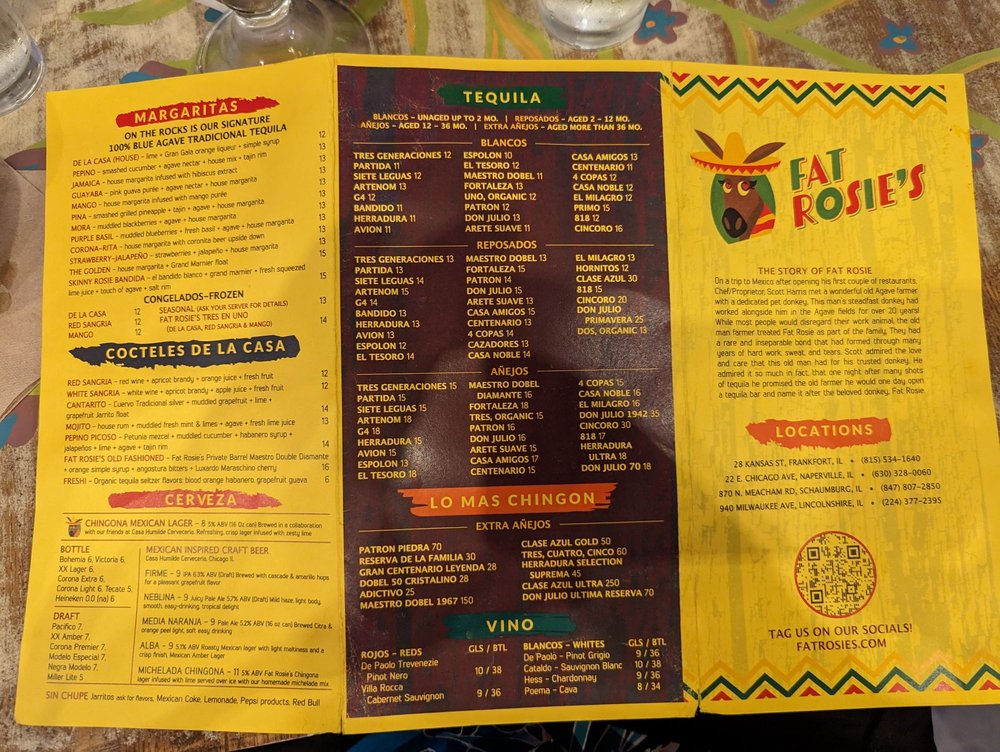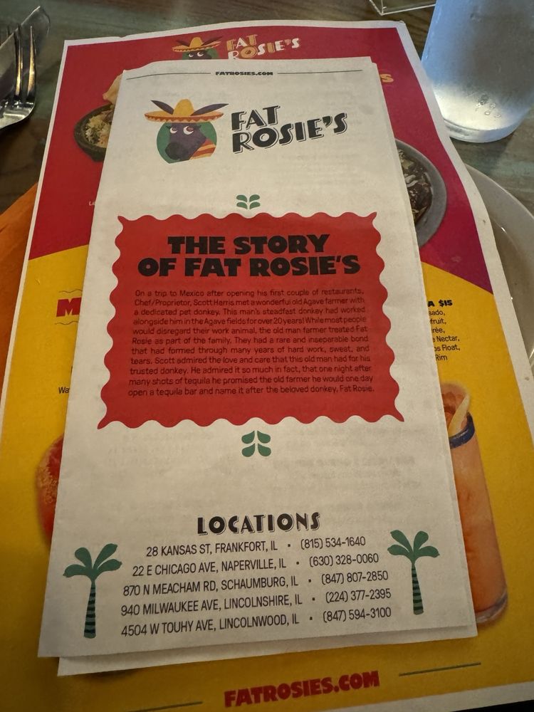 Fat Rosie's Taco and Tequila Bar in Naperville, IL offers a vibrant and festive atmosphere with a menu celebrating authentic Mexican flavors. Standout dishes like tacos, enchiladas, and guacamole impress, alongside perfectly balanced margaritas in various flavors. The generous portions and tasty offerings make it a popular spot for groups and families. The staff's attentive service adds to the overall experience, while the lively birthday celebrations with music and sombreros create a unique touch. Despite some noise levels, the overall dining experience at Fat Rosie's is delightful and unforgettable. It's a must-visit destination for delicious food, great vibes, and memorable celebrations.
